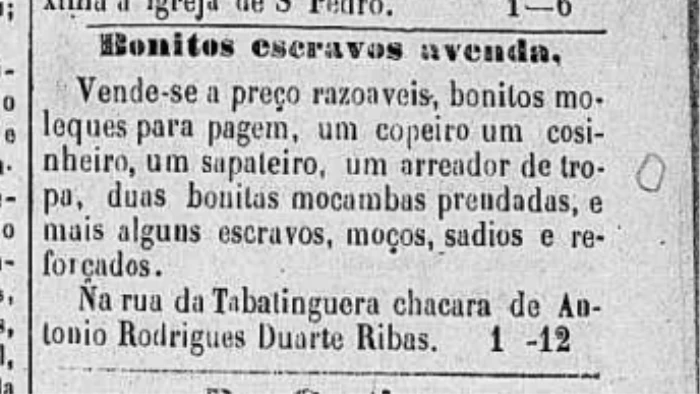 Era julho de 1862 quando Antônio Ribas, proprietário de uma chácara na região da Sé, centro de São Paulo, anunciou seus “bonitos escravos à venda” no jornal Correio Paulistano. “Vende-se a preço razoável”, especifica o comunicado (no topo da matéria), detalhando que havia “moleques” e “duas bonitas mocambas prendadas”.