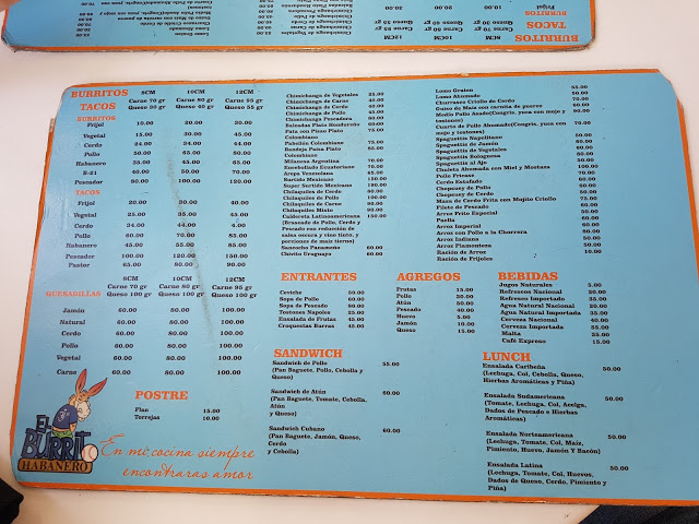 Nos restaurantes turísticos, o preço é sempre em CUC. Estes restaurantes são extremamente caros para os cubanos. Nestes, um prato costuma variar entre 10 e 25 CUC. Procurando restaurantes (ou paladares) onde comem os cubanos, os preços são bem mais em conta. Encontramos um desses, e a minha conta, comendo um dos pratos mais caros, bebida e sobremesa, não passou de 4 CUC.
