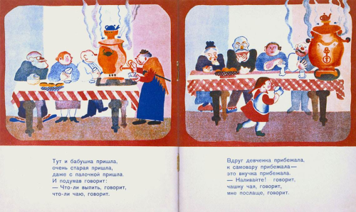 Foi o caso da pintora e artista gráfica Vera Ermoláieva (1893-1937) que, entre outros trabalhos ilustrou o livro Ivan Iványtch, o samovar, escrito por Kharms e publicado em 1929. Acusada de propagar ideias antissoviéticas, Ermoláieva foi fuzilada aos 44 anos. Kharms teve destino parecido: preso pelo mesmo motivo, morreu de fome em uma instituição psiquiátrica aos 36 anos. “Marchak também foi perseguido, mas, provavelmente por ser uma figura influente na União Soviética, escapou da prisão. Mesmo assim, viu muitos de seus colaboradores morrerem e precisou mudar de São Petersburgo para Moscou, onde trabalhou como tradutor até o final da vida, na década de 1960.”