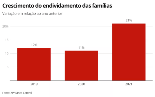 O endividamento das famílias brasileiras cresceu 21% no ano passado em relação a 2020. A alta foi puxada por linhas de crédito mais caras e sem garantias, segundo aponta um relatório elaborado pela equipe de Renda Fixa da XP com base em dados do Banco Central. Com a alta, o endividamento passou a consumir mais da metade da renda das famílias.