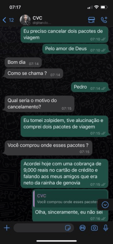 “Eu tomei zolpidem, tive alucinação e comprei dois pacotes de viagem”, relatou o jovem em uma conversa com o vendedor do pacote.