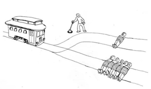 Um bonde desgovernado está chegando. Há uma pessoa próxima à alavanca. Se o bonde continuar por seu caminho, atropelará cinco pessoas amarradas aos trilhos e elas morrerão. Se a pessoa acionar a alavanca, o bonde atropelará apenas uma pessoa amarrada no outro caminho e ela morrerá. Nesse caso, é moralmente permissível acionar a alavanca?