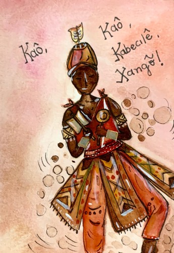 Um dos itans deXangô conta que ele foi um rei muito poderoso, muito viril e de grande beleza, teve diversas esposas, dentre elas: Iansã, Obá e Oxum. Um dia, pensando em uma nova magia para derrotar seus inimigos, dedicou-se a um experimento. Quando finalmente conseguiu, subiu em uma colina e lançou, era seu raio, seu trovão. Porém, foi tão forte e inigualável que caiu sobre seu reinado. Incendiou a cidade e matou grande parte de seus súditos. Fugindo para exílio, devastado por sua ação, a dor não deu trégua. E, a partir disso, tomado pela tristeza bateu seus pés no chão, desaparecendo terra adentro. Assentando seu axé na terra, torna-se orixá. Força potente da natureza. “Do direito ao chão para o direito ao encanto” (2022, p. 20).