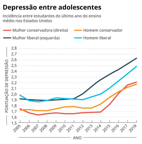 Uma pesquisa publicada no fim do ano passado disparou um grande debate nos Estados Unidos sobre a relação entre saúde mental e política. O estudo, publicado na revista SSM Mental Health, apontou uma correlação intrigante entre a identidade política dos adolescentes e uma escala que mede depressão. Estudantes do último ano do ensino médio (17 e 18 anos) que se identificam como “liberais” (na tradição americana, de esquerda) têm pontuação média significativamente maior na escala que mede depressão do que aqueles que se identificam como “conservadores”. A diferença aparece em toda a série histórica e, mesmo quando a depressão entre todos os adolescentes dispara, no começo dos anos 2010 (provavelmente pelo maior uso de mídias sociais), a pontuação é maior para adolescentes de esquerda e maior ainda para meninas de esquerda (ver gráfico acima).