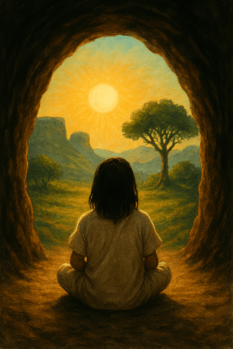 Quando esses meninos saem da caverna aos 9 anos, veem o mundo como se fosse a primeira manhã da Criação. O céu não é apenas azul. É milagre. A árvore não é apenas vegetal. É irmã. Cada forma contém alma. Cada cor vibra sentido.