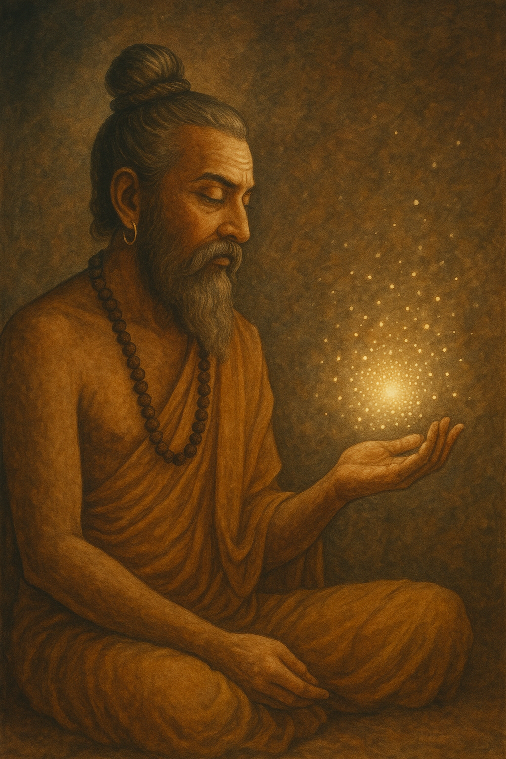 Acharya Kanad (Kaṇāda), sábio e fundador da escola Vaiśeṣika, propôs uma das primeiras teorias atomistas: o universo formado por “anu” (átomos indivisíveis) e classificado por leis e categorias — uma ontologia precoce que aproxima filosofia e pensamento científico na Índia antiga.