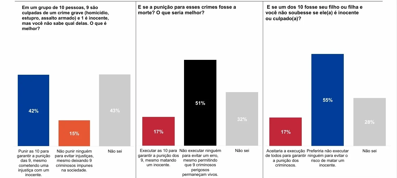 Diante de um dilema em que dez pessoas são acusadas de crimes graves e apenas uma é reconhecidamente inocente (sem que se saiba qual), 42% dos brasileiros preferem punir as dez para garantir punição das nove culpadas, mesmo cometendo uma injustiça direta contra um inocente. Apenas 15% responderam que o melhor é não punir ninguém para se evitar uma injustiça e garantir o princípio legal da “presunção da inocência”.