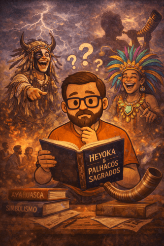 Comecei a pesquisar sobre figuras espirituais associadas ao riso. Não demorou para eu encontrar os Heyoka, na tradição Lakota. Os chamados “palhaços sagrados” ou “contrários”. Xamãs que agem ao avesso, que falam invertido, que vestem roupas do lado errado, que quebram normas para expor a rigidez da própria comunidade. Não são palhaços no sentido moderno. São cirurgiões simbólicos. Usam o humor como bisturi.