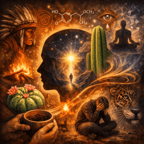 Presente em cactos como o Lophophora williamsii (peiote) e o Echinopsis pachanoi (São Pedro), ela atravessa séculos como um fio invisível que liga o humano ao mistério — não como fuga, mas como confronto, expansão e, às vezes, reconciliação.
