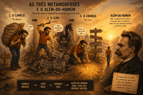 Se essa travessia te cutucou por dentro, se você percebeu que já carregou peso demais, já quebrou tudo e talvez esteja tentando reconstruir, então meu livro “Nietzsche para Todos: Filosofia com Humor para o Dia a Dia” pode ser um bom companheiro de jornada — não para te dar respostas prontas, mas para te ajudar a pensar, rir e, aos poucos, aprender a criar o seu próprio sentido no meio do caos.